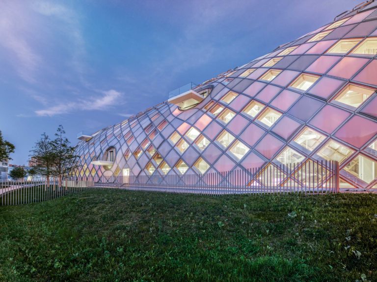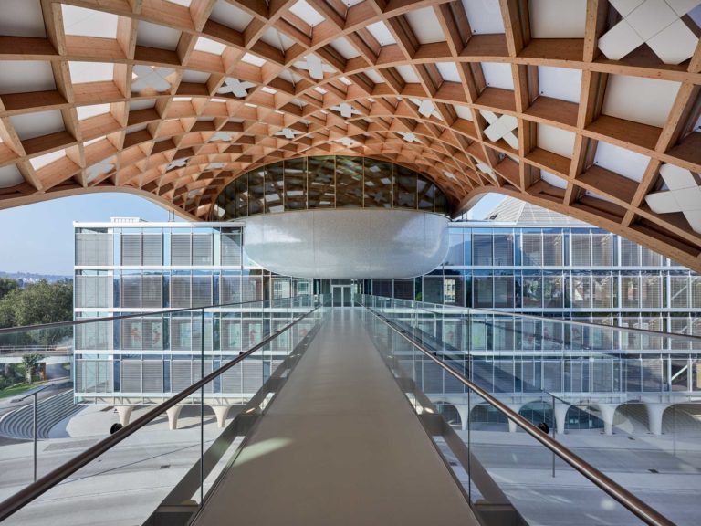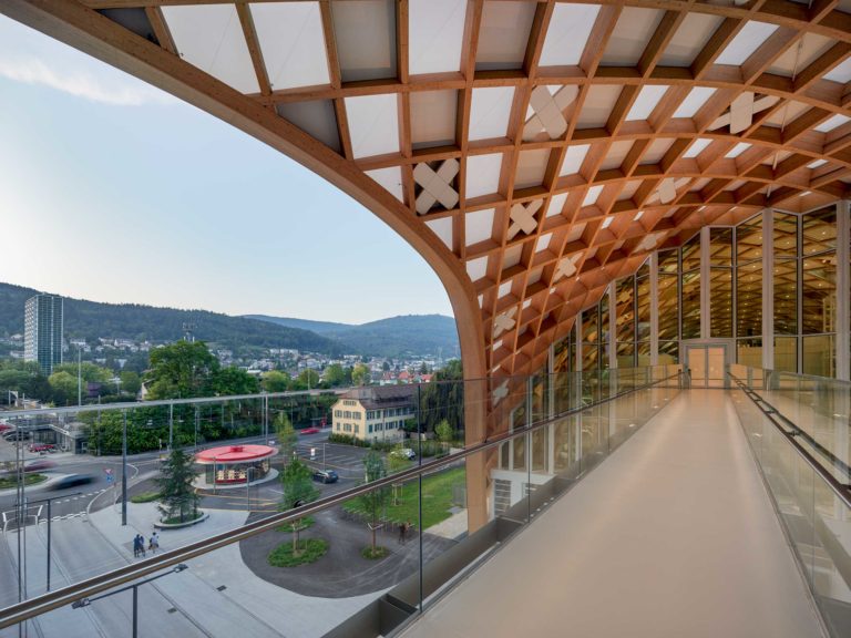 La vaste façade de l’édifice repose sur une ossature grillagée en bois. Ce matériau traditionnel a été choisi pour ses propriétés écologiques et durables. De plus, le bois peut être travaillé avec flexibilité et permet des découpes extrêmement précises. Ce sont là des qualités indispensables pour une construction dans laquelle chaque millimètre compte. Lors de la phase de planification, la technologie 3D la plus récente a permis de définir la forme et le positionnement exacts des quelque 4’600 poutres de l’enveloppe de la grille en bois.